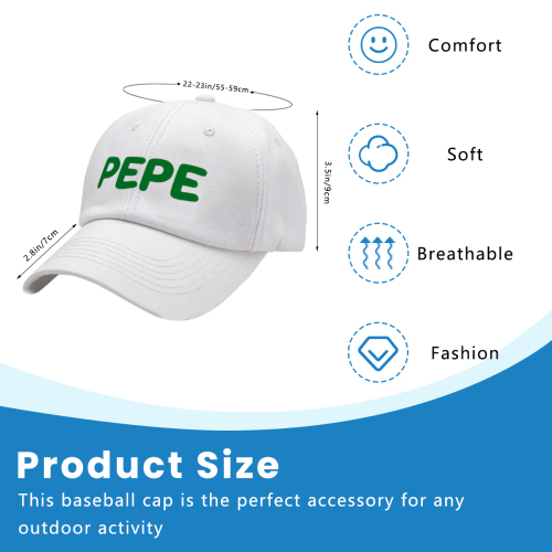 Show your love for meme culture with this Pepe Cap featuring the bold PEPE logo. Crafted from durable polyester with heat-transfer printing, it combines a lightweight feel with lasting design quality. The adjustable buckle ensures a perfect fit, making it an ideal accessory for outdoor activities, casual wear, or crypto community gatherings. A stylish way to express your identity in the world of Web3.